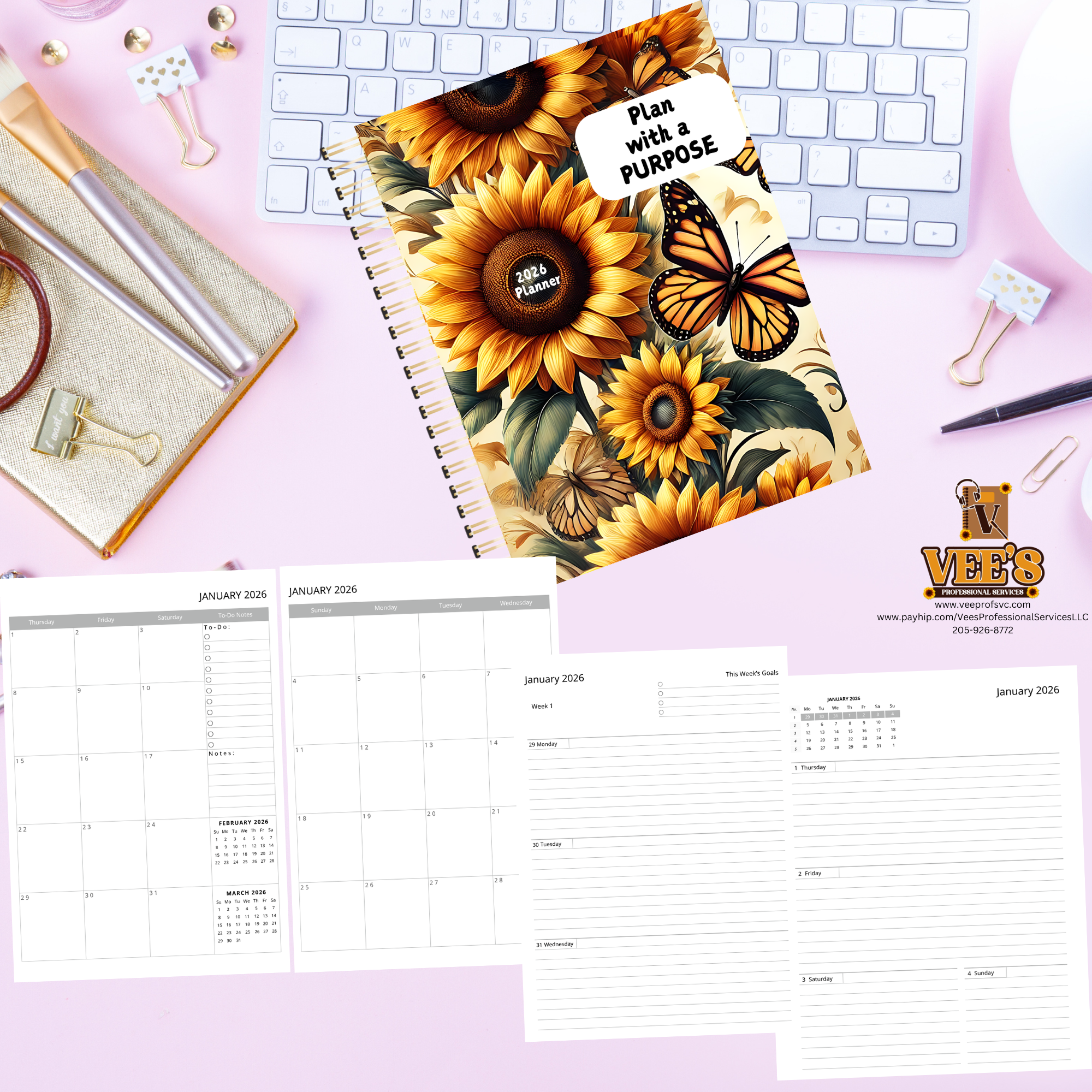 Stay organized, focused, and inspired all year long with this beautifully designed Monthly & Weekly Planner from Vee’s Professional Services. Featuring vibrant sunflowers and butterflies, this planner brings motivation and joy to your planning routine — reminding you to Plan with a Purpose!